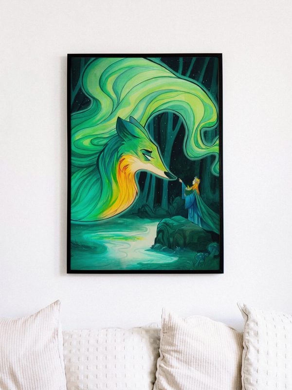 16 x 20 inches framedIÂ had an amazing time painting this piece in acrylics. My favorite animal is a fox so I couldn’t resist. There is something about a fox that I simply love. Shifting the colors over to green give it a unique look.